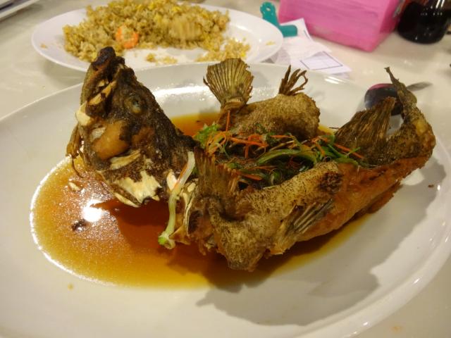 ハタの唐揚げ醤油ベースソースがけ。大きなハタを選んだので見応えたっぷり。ソースはタイで例えるとナンプラー風味の中華風で美味しかったけど、ハタ自体がちょっと生臭くて残念でした。東南アジアの大きな魚は大体生臭いというか、仕方ないのかも知れませんね。