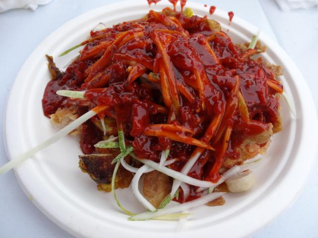 屋台を見ると揚げ物が沢山並んでいます。魚のすり身を揚げたものや、ゆで卵を揚げたもの、その他何でも揚げてあって、好きな具材を選ぶと細かく切ってくれてモヤシを乗せ、ミートソースの様なソースをかけてくれます。