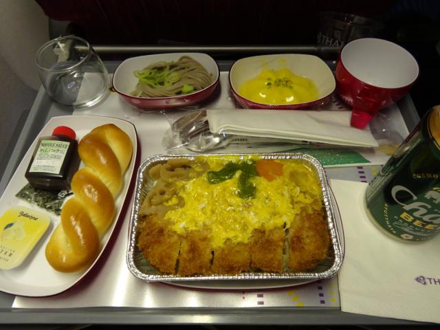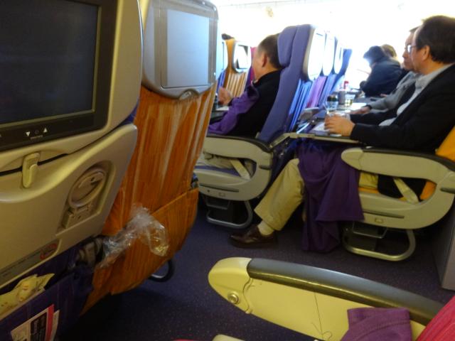 セントレア発のタイ航空は飛行機が頻繁に変わります。古い機体に当たると足置きが無かったり狭かったりします。一時期ファーストクラスの付いた豪華な飛行機だった時期があるのですが、最近はビジネスとエコノミーだけの古めの機体が多いのです。