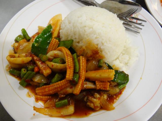カイランサイとヤングコーン、イカ、タコをチリソースで炒めた様なもの。