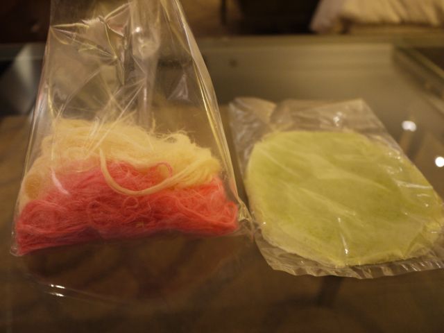 薄いクレープ生地に、ピンクや緑の綿あめを細く裂いたものを乗せて巻き巻きして食べる。