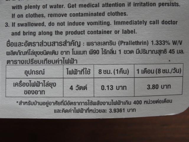 裏面の説明書きには1日8時間使って1ヶ月の電気代は約3.8バーツだそうです(1ユニット辺り3.9361バーツで計算しているみたいです)