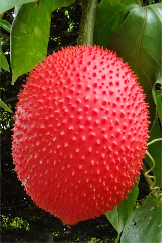 調べてみるとこの木の実はベトナム原産の「GACフルーツ(ガックフルーツ)」と呼ばれる瓜科のフルーツだそうで、日本ではナンバンカラスウリと呼ばれているそうです。
